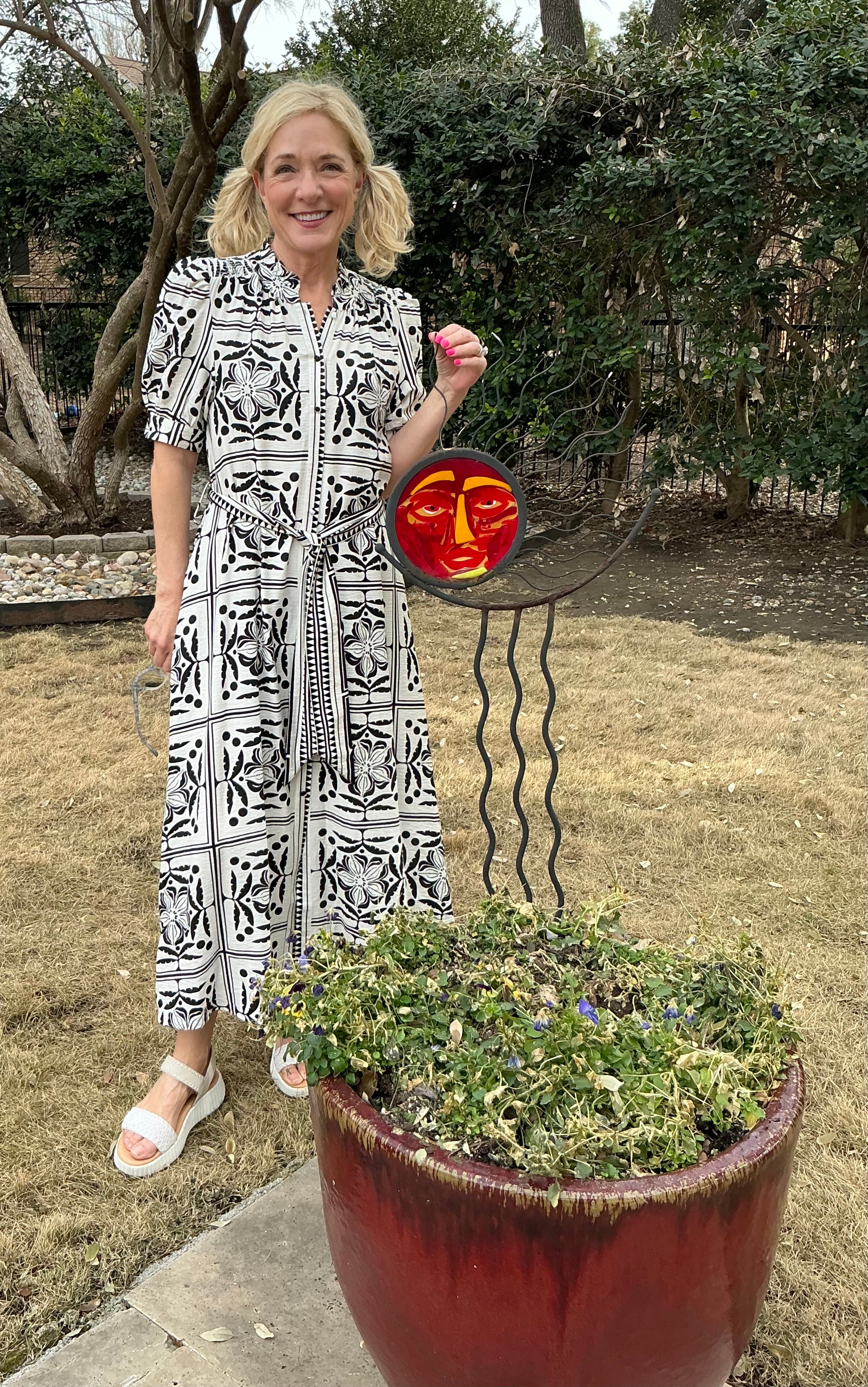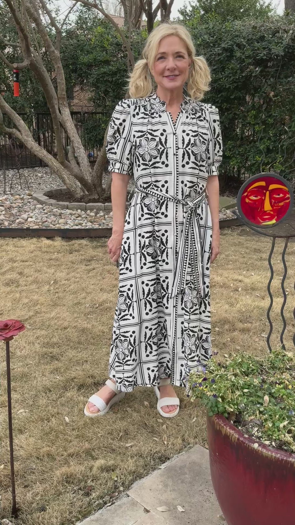 A bold Black & White print maxi dress that button down the entire front. Short banded sleeves with a button closure &.side pockets. Rushing at the shoulders & soft pleats in the back & also front top. A contrasting tie belt & front placket. Classic